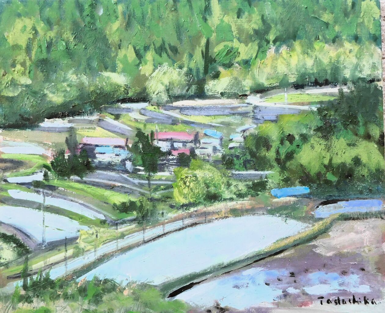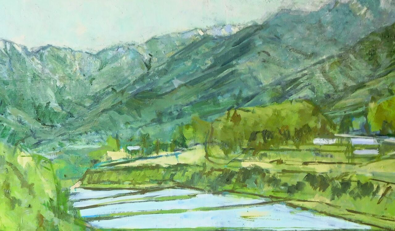 2025年08月20日 山梨車中泊棚田スケッチ旅・平林の棚田(油彩) にほんブログ村5月に水彩スケッチしてきた山梨の棚田のうち、下笹尾の棚田は油彩100号に描き、そのほかの棚田は小さい油彩を3枚描いた。この平林の棚田は水が入り始めたばかりだった。あちこちで水音がしていたが、まだ殆どの田に水がなかった。田に水がないと、どうも雰囲気が出ない。少し水を入れて描いた。山梨県南巨摩郡富士川町平林の棚田(油彩F8)話変わって、2,3日前、南魚沼でクマ被害があった。2年前、スケッチ行ったところなので驚いた。スケッチ先でクマ注意の看板に出会うこともある。他人ごとではない。 タグ :#山梨の棚田#油彩風景画#平林の棚田