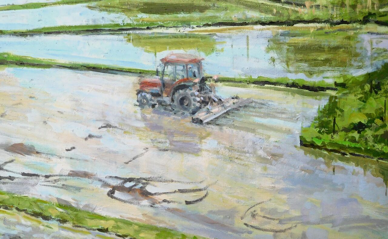 2025年08月03日 下笹尾の棚田・100号(続き) にほんブログ村秋の公募展向けに描いている100号の棚田は、もうこれ以上手が入らなくなった。自分としては、ほぼ完成なのだが、この状態で、過去の研究会では、「もっと描きこめ」と云われてきた。自分の感覚では、この程度でも描き過ぎのような気がする。コロナを機に研究会に行かなくなって久しい。年齢的に、これから何十年も描くわけでもないから、もう自分の感覚で通してもいいだろう。100号部分 トラクターがない方がすっきりすると妻が云う 悩むところだしばらく手をおいて、眺めている時間が長くなると、絵として落ち着かないところが見えてくる。見えた風景をそのままを描けばいいわけではない。創らなければ絵にならないことが多いのだ。それをまとめて一気に修正をする。今は、筆の勢いを無くさないように、少し小さいサイズの棚田を描いている。100号を描いた後では、P10くらいだとあっという間に色が埋まる。 タグ :#下笹尾の棚田#100号